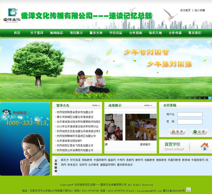 雷澤文化傳播有限公司總部位于河北省省會——石家莊,是一家專門從事學習方法培訓、項目研發(fā)、市場推廣的大型特色教育機構(gòu),自年成立以來,自主研發(fā)了《北禾速讀速記教學法》等提升中小學生特長能力的系列教程,受到社會各界的普遍關注和認可。公司始終堅持學生素質(zhì)和能力教育、教學方法的研究開發(fā)、培訓推廣及相關產(chǎn)品的研制經(jīng)營工作。是目前國內(nèi)專業(yè)從事此領域研究與應用的教育機構(gòu)之一。